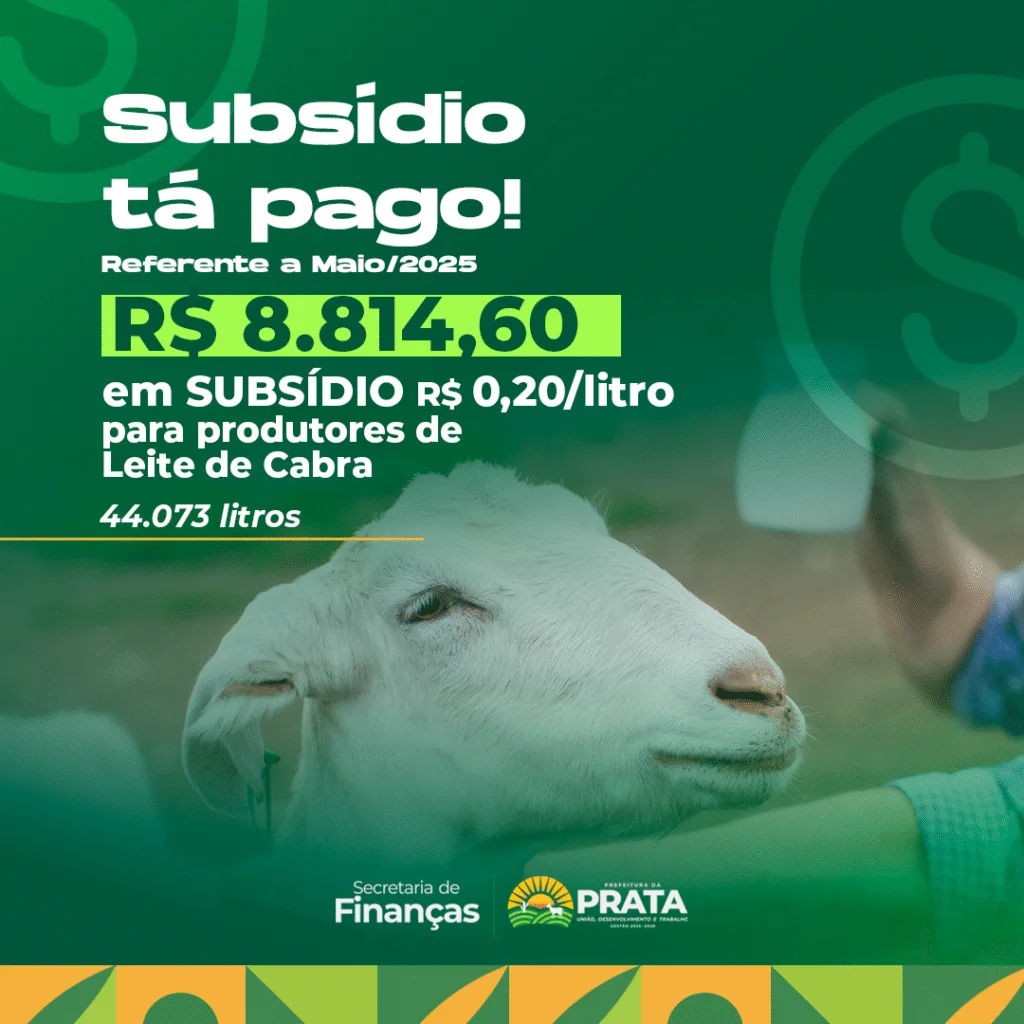 A Prefeitura Municipal da Prata, sob a gestão do prefeito Genivaldo Tembório, anunciou nesta semana o pagamento do subsídio referente ao mês de maio de 2025 para os produtores de leite de cabra do município. Ao todo, foram destinados R$ 8.814,60, contemplando a produção de 44.073 litros, ao valor de R$ 0,20 por litro.