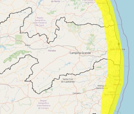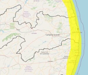 Além do litoral paraibano, o alerta é válido para a região Metropolitana de Recife, Mata Paraibana, Mata Pernambucana, Oeste Potiguar, Leste Potiguar, Central Potiguar, Agreste Potiguar e Leste Alagoano.