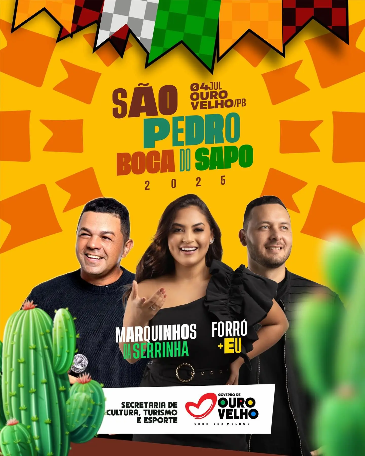 O prefeito de Ouro Velho, Dr. Júnior, divulgou a programação oficial do tradicional São Pedro da comunidade Boca do Sapo, que será realizado na próxima sexta-feira, dia 4 de julho. O evento promete movimentar a zona rural com muito forró, cultura e valorização das tradições juninas.