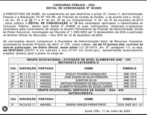 A Prefeitura Municipal de Sumé divulgou, nesta sexta-feira (11), o Edital de Convocação nº 18/2023, referente ao concurso público realizado no ano de 2023. A convocação foi publicada oficialmente no Diário Oficial do Município e contempla candidatos aprovados para os cargos de motorista e nutricionista.