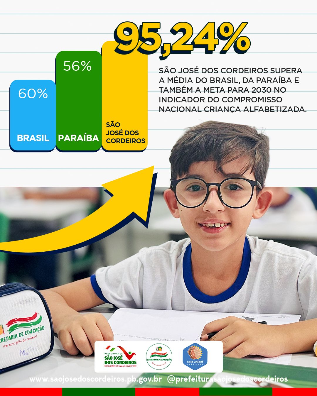 Com esse resultado, São José dos Cordeiros superou a média nacional, a média estadual da Paraíba e também ultrapassou a meta estabelecida para o ano de 2030 no indicador do Compromisso Nacional Criança Alfabetizada. O desempenho expressivo evidencia o avanço da Rede Municipal no processo de alfabetização e consolidação das competências básicas de leitura e matemática no Ensino Fundamental I (2º ano).