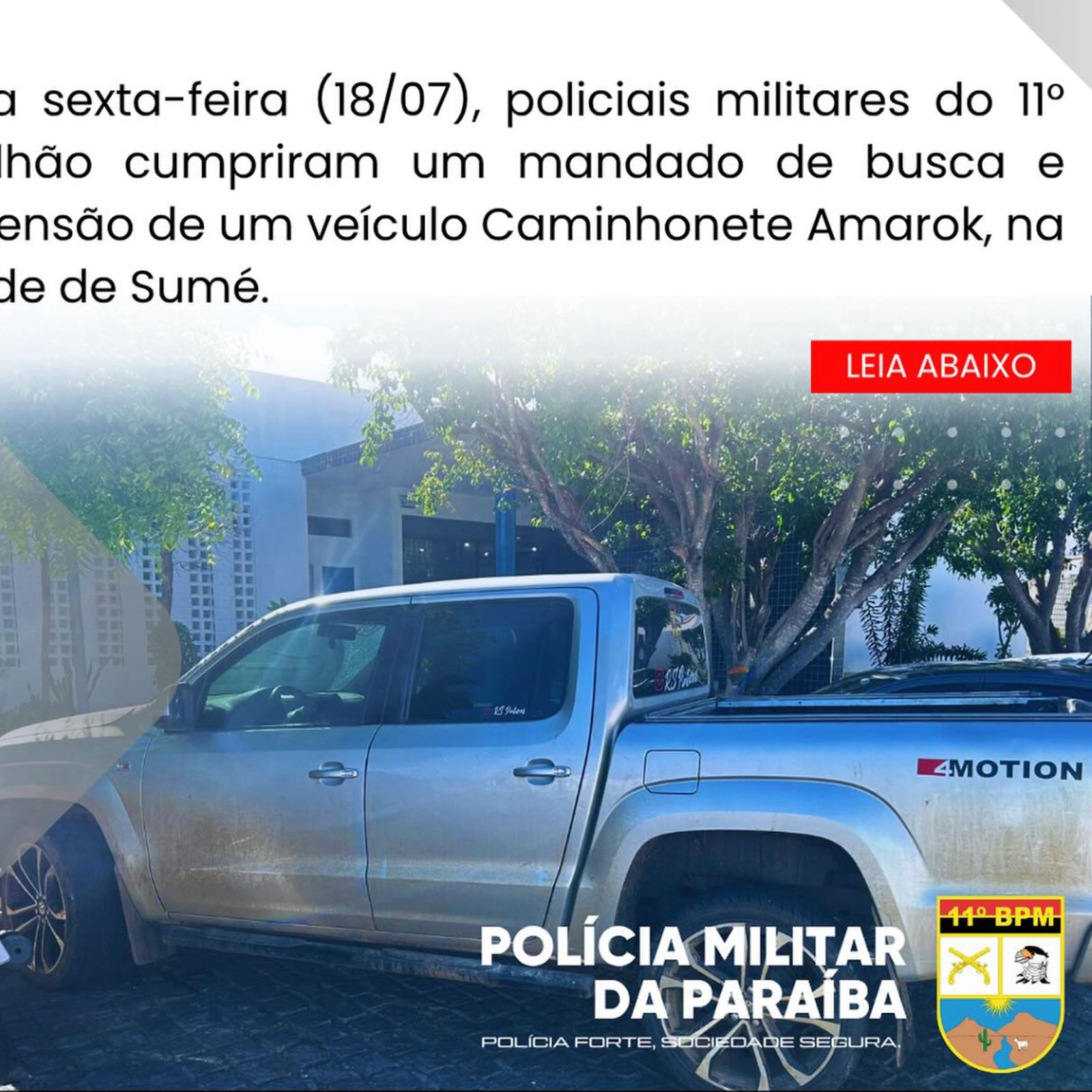 Na manhã desta sexta-feira, 18 de julho, a Polícia Militar da Paraíba, por meio do 11º Batalhão, realizou a apreensão de uma caminhonete modelo Amarok na cidade de Sumé, no Cariri paraibano. A ação foi fruto do cumprimento de um mandado de busca e apreensão expedido pela Justiça.