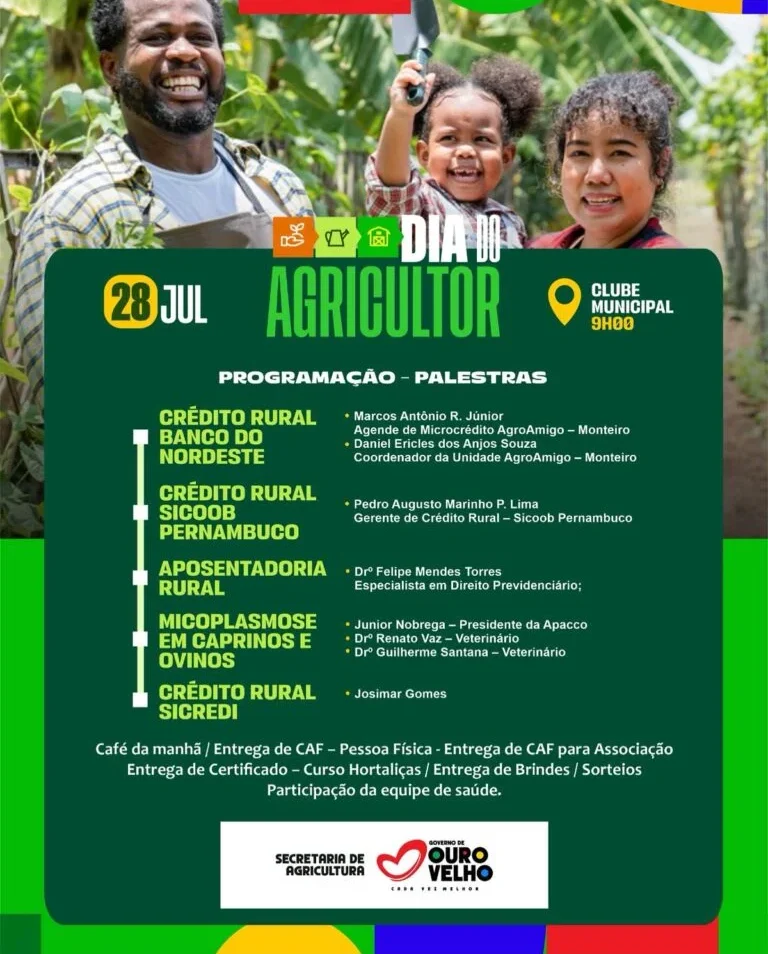 A Prefeitura de Ouro Velho, por meio da Secretaria de Agricultura, realiza na próxima segunda-feira, 28 de julho, a partir das 9h, no Clube Municipal, uma programação especial em celebração ao Dia do Agricultor. A iniciativa reforça o compromisso da gestão do prefeito Doutor Júnior com o fortalecimento e valorização da agricultura familiar.