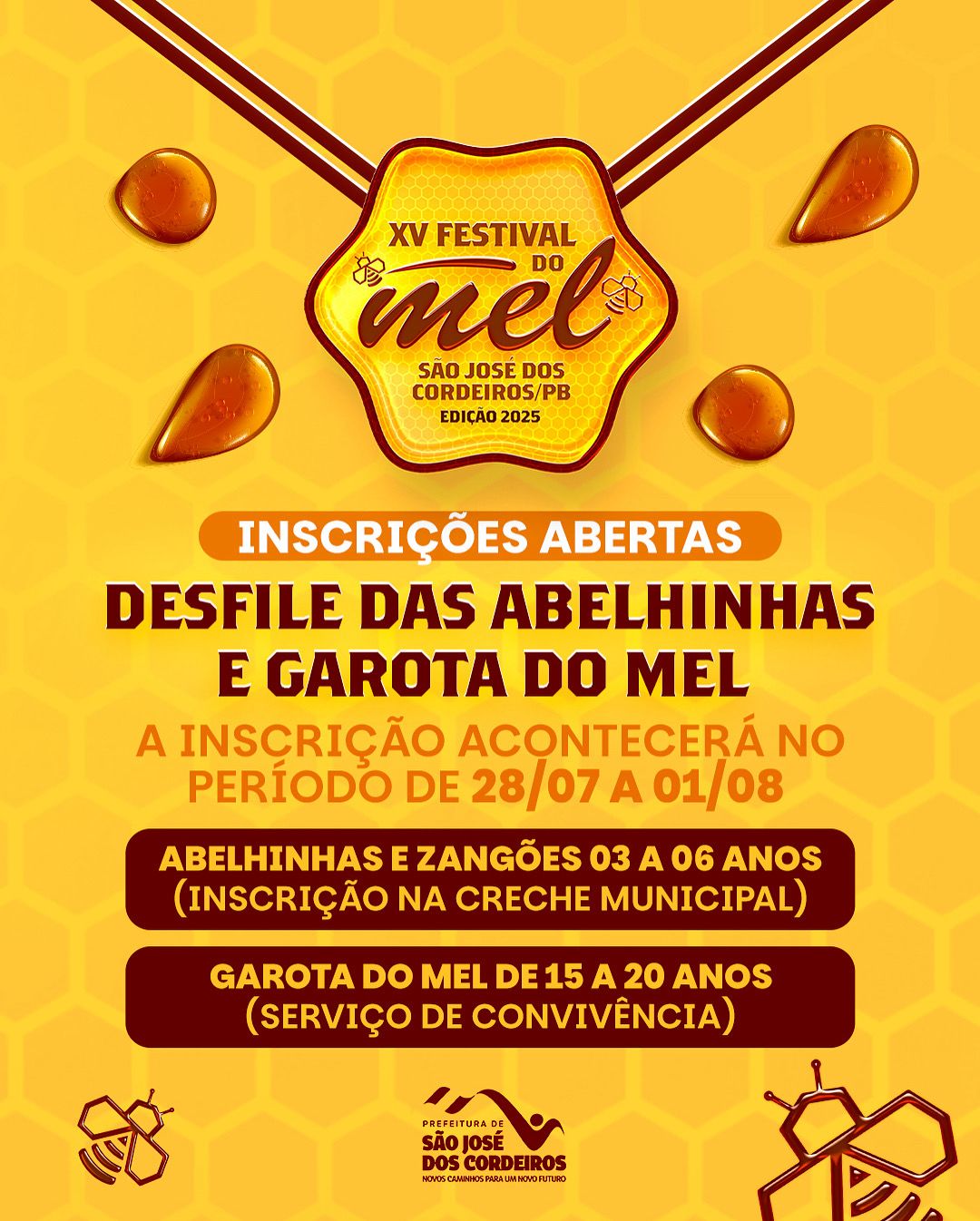 A Prefeitura de São José dos Cordeiros anunciou a abertura das inscrições para os concursos “Garota do Mel” e “Abelhinhas”, que integram a programação oficial da XV edição do Festival do Mel 2025, um dos eventos mais aguardados do Cariri paraibano.