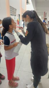 2ª etapa – Escovação supervisionada com aplicação de flúor. “Após a palestra, os profissionais realizam uma escovação supervisionada, utilizando flúor e apenas a escova de dente que foi entregue no kit. Nessa etapa, os alunos aprendem sobre a técnica correta de escovação e os benefícios da prevenção”, explicou Aline.