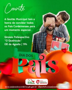 A Prefeitura Municipal de São José dos Cordeiros, por meio da Secretaria de Assistência Social e com o apoio de outras secretarias parceiras, promoverá nesta sexta-feira(08/08), uma noite especial em comemoração ao Dia dos Pais. O evento acontecerá a partir das 19h, no Ginásio de Esportes “O Queirozão”, e será voltado à valorização da figura paterna e ao fortalecimento dos laços familiares na comunidade.