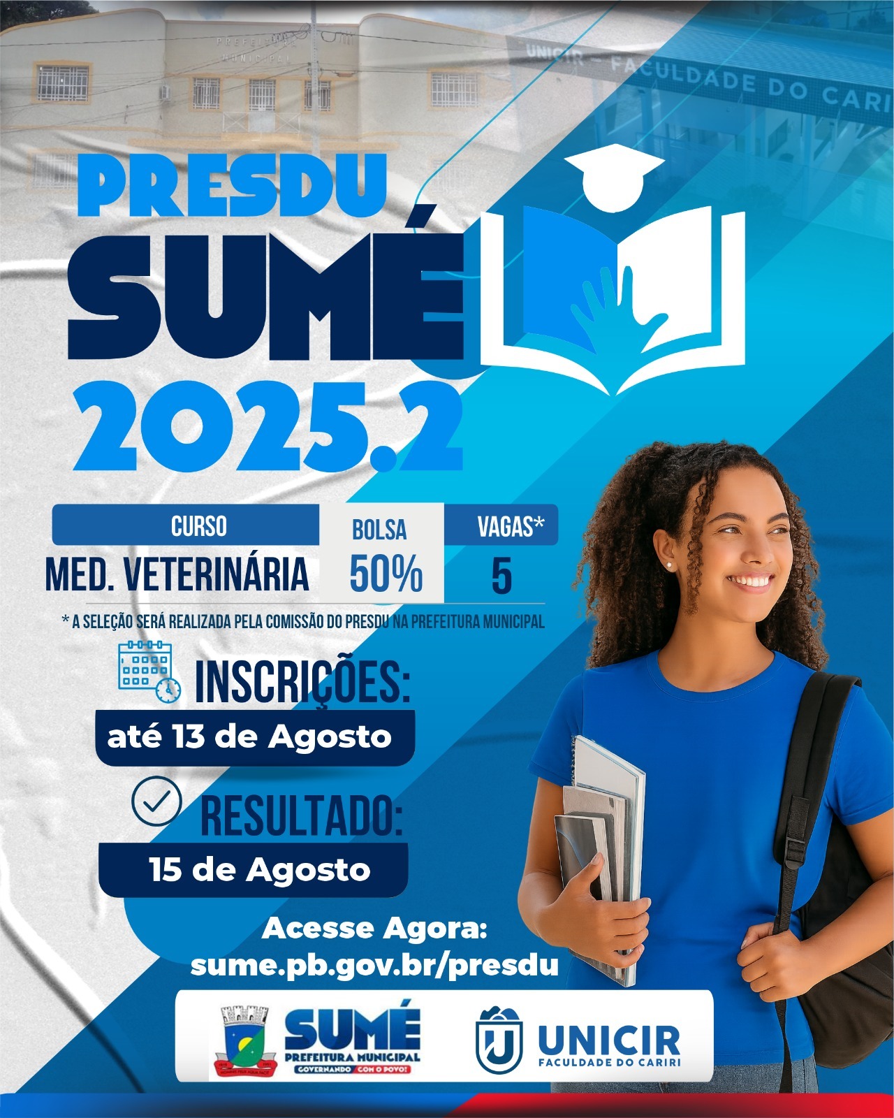 A Prefeitura de Sumé, em parceria com a Faculdade do Cariri Paraibano – UNICIR, lança nesta quinta-feira (07) o Programa Municipal de Educação Superior para Todos – PRESDU, por meio do Edital nº 01/2025, que oferta bolsas de estudo de 50% para o curso de Medicina Veterinária, no turno noturno, com duração de 5 anos.