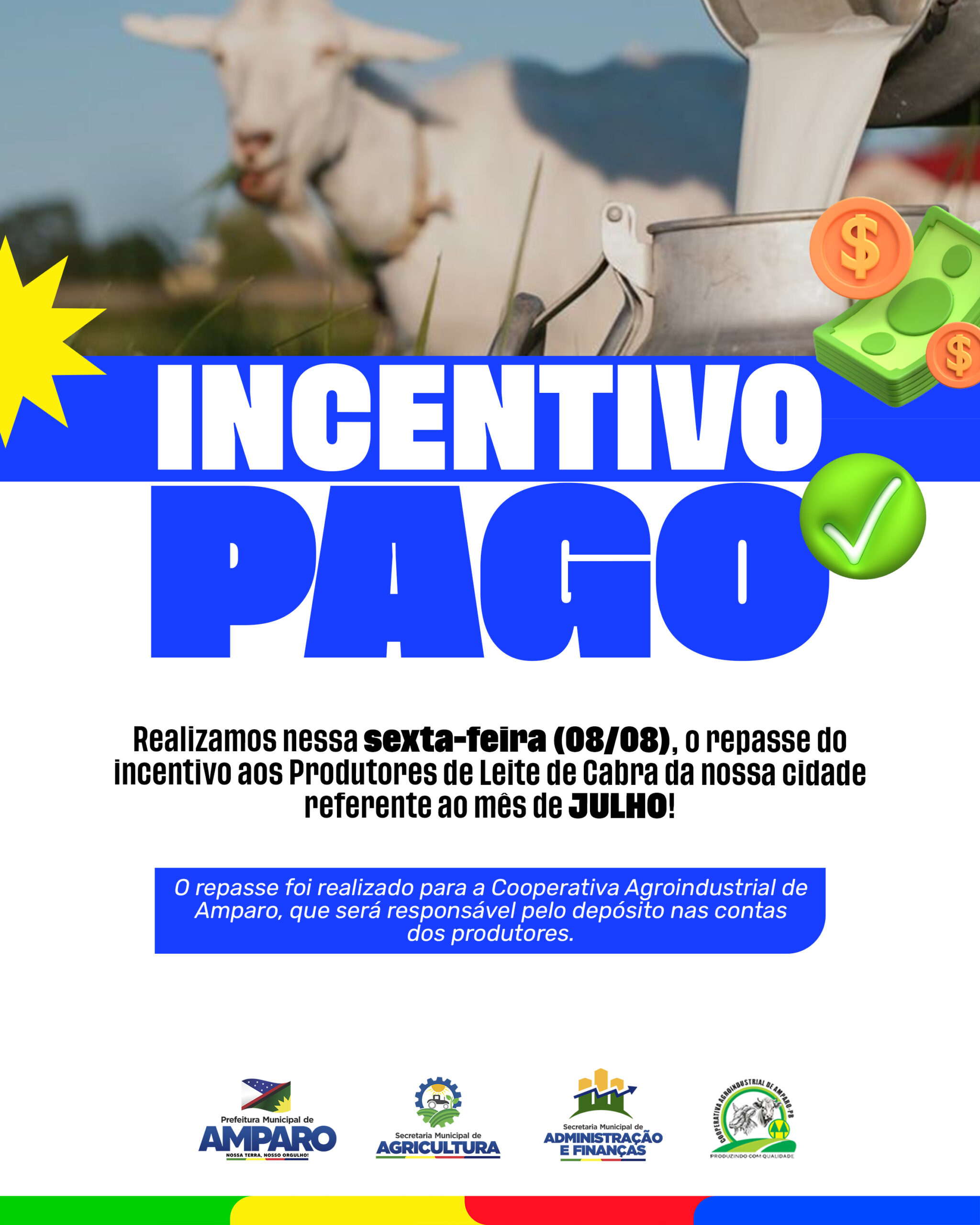 A Prefeitura Municipal de Amparo, por meio da Secretaria de Agricultura, efetuou nesta sexta-feira (08/08) o repasse do incentivo financeiro destinado aos produtores de leite de cabra do município, referente ao mês de julho.