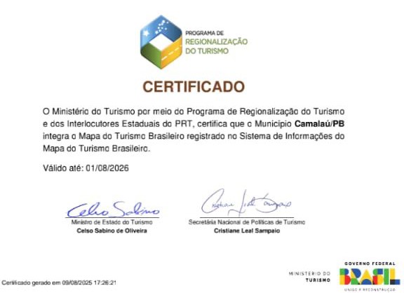 A certificação, assinada pelo Ministro do Turismo, Celso Sabino de Oliveira, e pela Secretária Nacional de Políticas de Turismo, Cristiane Leal Sampaio, é fruto de uma luta constante construída através de várias mãos: o empenho do Fórum Regional de Turismo através do seu presidente Eduardo Belo, o empenho e apoio do Sebrae através da dirigente regional do Cariri Paraibano Madalena Arruda, do secretário de cultura, esporte e turismo Marinaldo Chaves, como também o prefeito Bira Mariano, atestando assim que Camalaú cumpre os critérios estabelecidos pelo Sistema de Informações do Mapa do Turismo Brasileiro, que inclui desde a estrutura de serviços voltados ao visitante até a relevância das manifestações culturais e eventos de impacto regional.