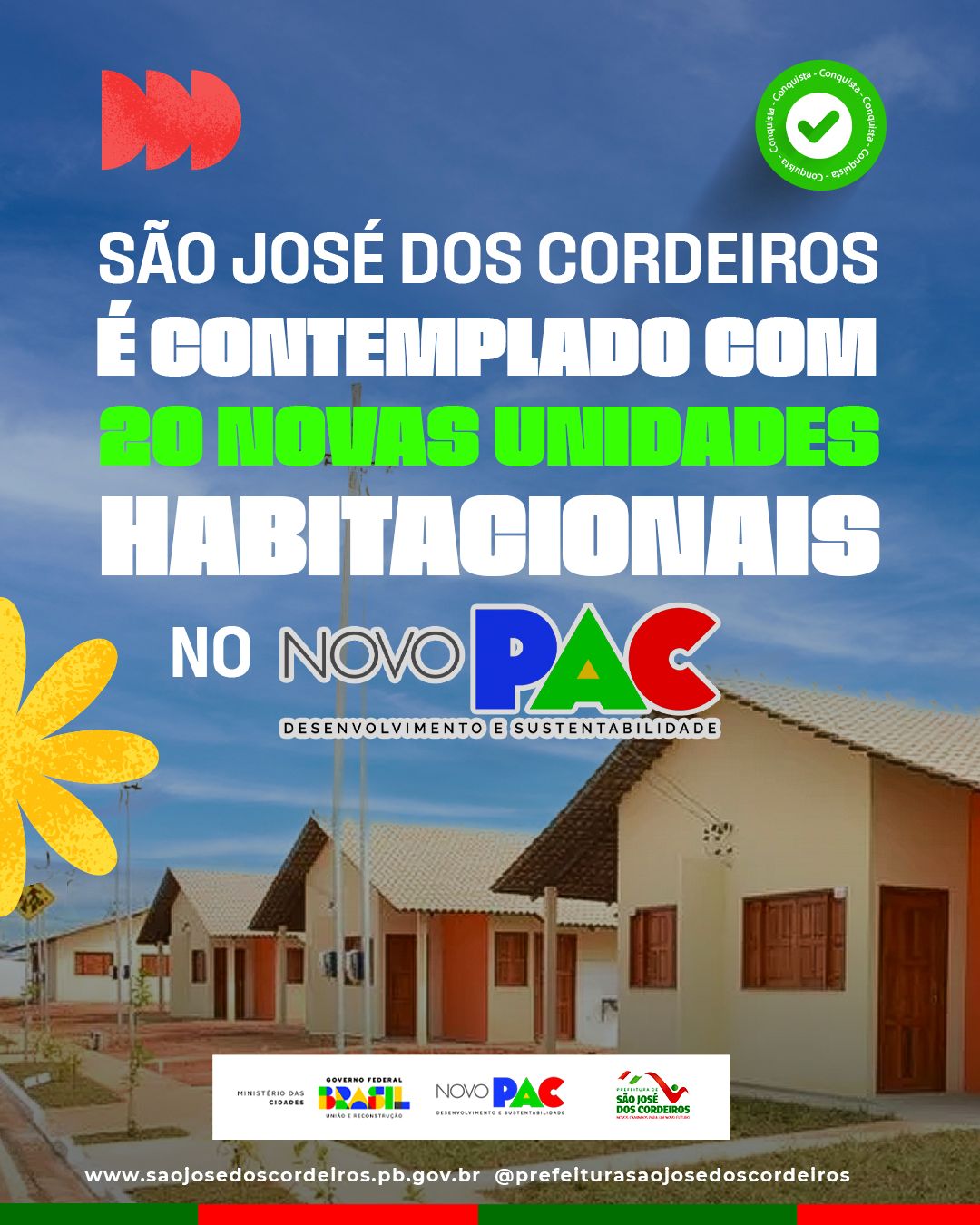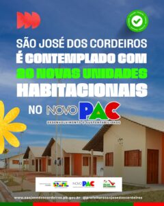 O município de São José dos Cordeiros foi contemplado com 20 novas unidades habitacionais do programa Minha Casa, Minha Vida, em parceria com o Governo Federal. A conquista é resultado da articulação do prefeito Felício Queiroz, que esteve em Brasília dialogando com parlamentares para garantir investimentos que melhorem a qualidade de vida da população.
