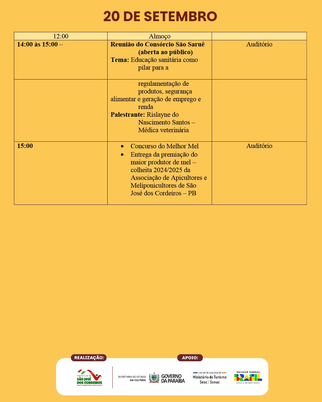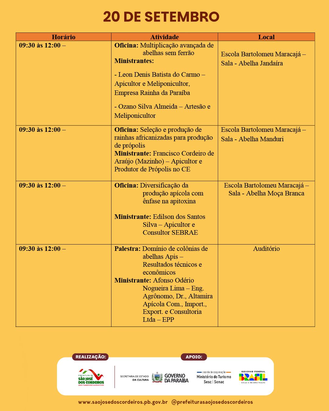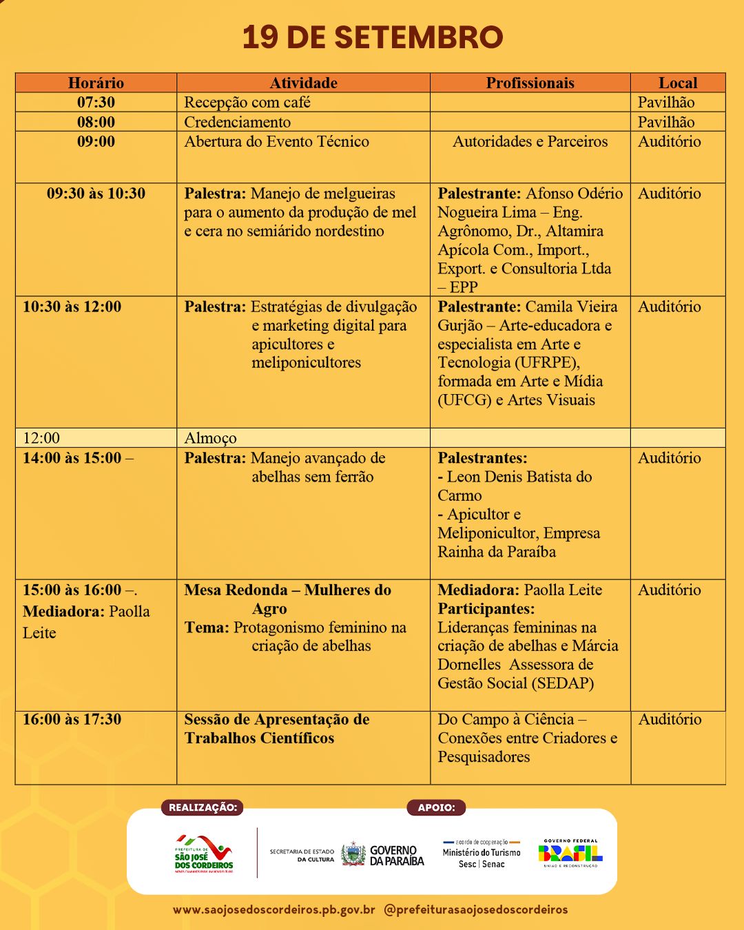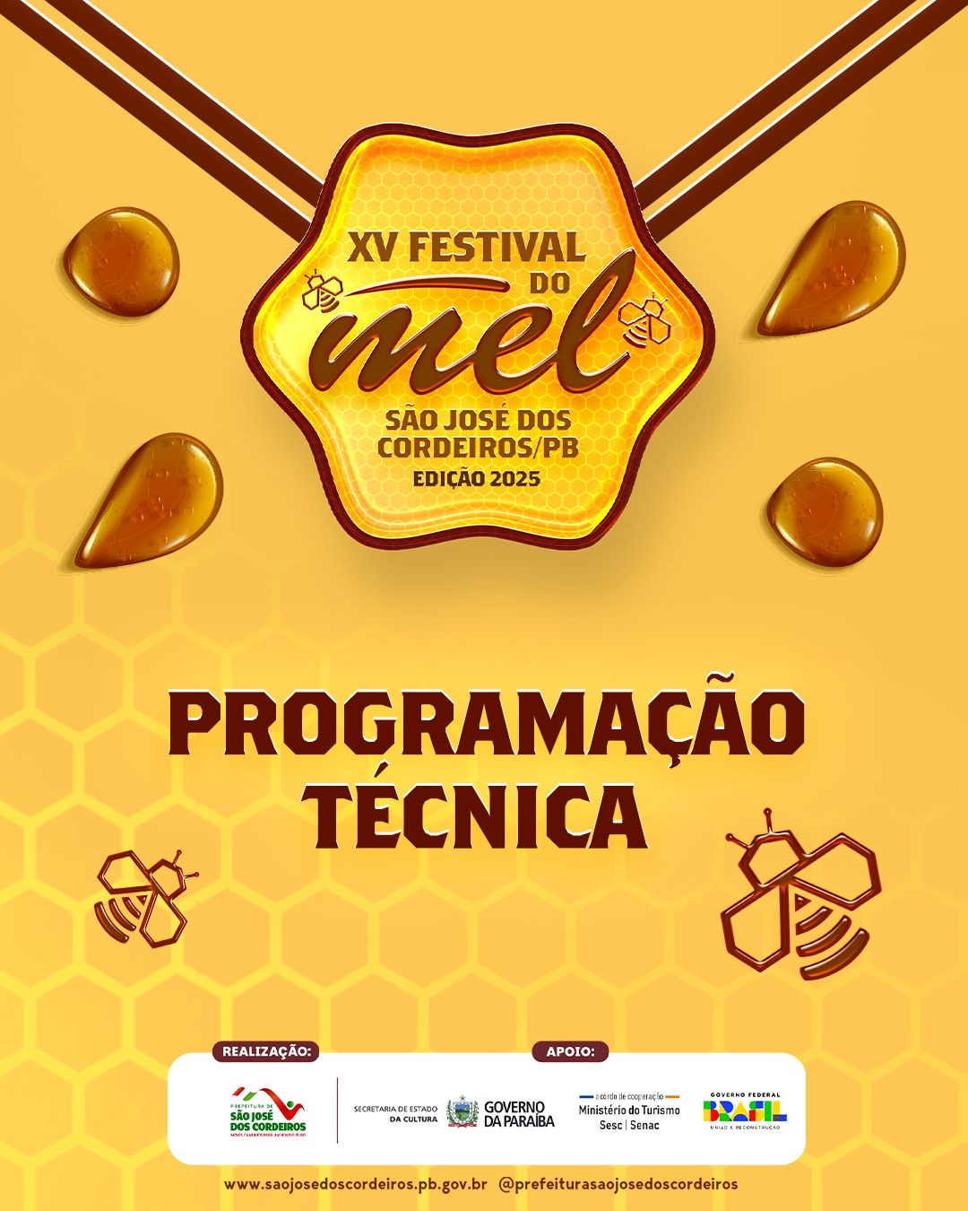 A Prefeitura de São José dos Cordeiros divulgou a programação técnica da XV edição do Festival do Mel, que acontece nos dias 18, 19 e 20 de setembro de 2025, consolidando o município como a verdadeira Capital do Mel do Cariri Paraibano.