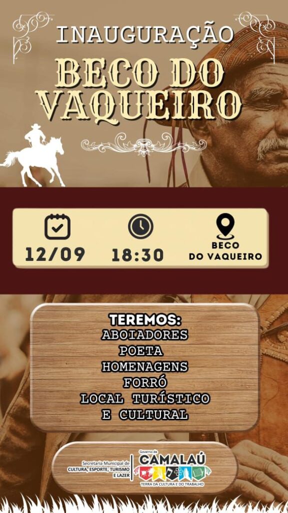 A Prefeitura de Camalaú, através da Secretaria Municipal de Cultura, Esporte, Turismo e Lazer, realiza nesta sexta-feira, dia 12 de setembro, a inauguração do Beco do Vaqueiro, um novo espaço turístico e cultural que promete valorizar a tradição e a identidade do povo camalauense.