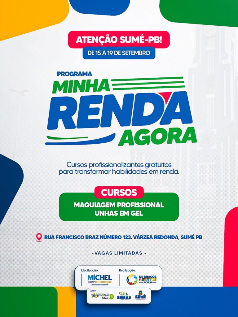 A cidade de Sumé receberá, entre os dias 15 e 19 de setembro, os cursos de Maquiagem Profissional e Unhas em Gel, promovidos pelo Programa Minha Renda Agora. A iniciativa é fruto da ação do vereador Arymatéia Silva, em parceria com o deputado estadual Michel Henrique, e conta ainda com o apoio da Prefeitura Municipal, por meio da Secretaria de Assistência Social.