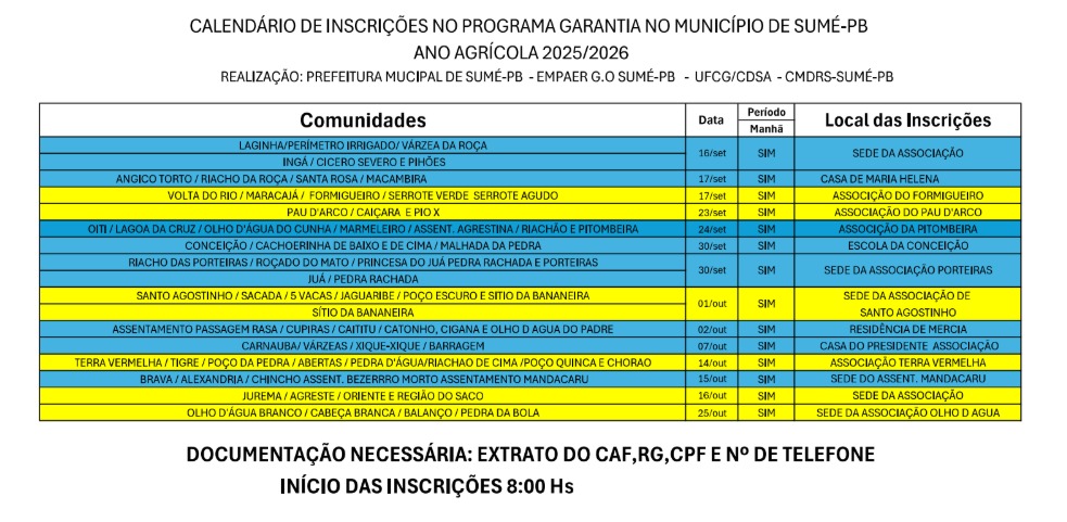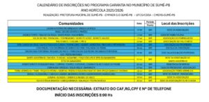 Agricultores e agricultoras familiares já podem se inscrever no Garantia-Safra 2025/2026. A Prefeitura de Sumé, em parceria com a Empresa de Assistência Técnica e Extensão Rural da Paraíba (Empaer), o Conselho Municipal de Desenvolvimento Rural Sustentável e o CDSA/UFCG estão dando apoio nas inscrições, de forma presencial, em dia e local específico, conforme calendário elaborado.