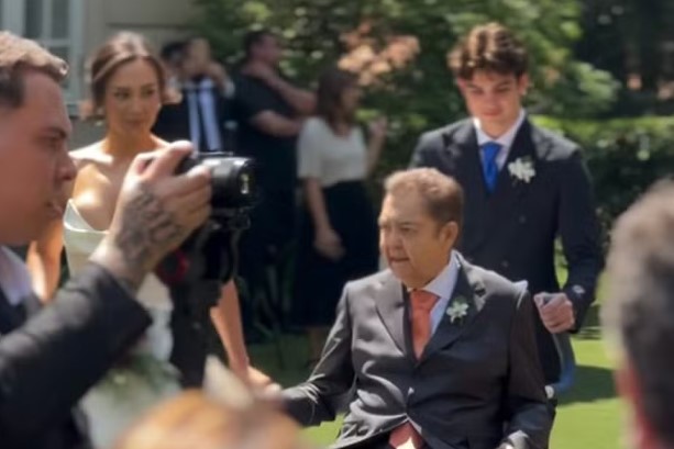 Em imagens publicadas pelo filho, João Silva, Faustão aparece de cadeira de rodas, de mãos dadas com a noiva. O filho mais novo, Rodrigo Silva, ajudou a levar a cadeira.