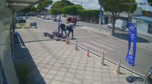 A vítima vinha com a filha em uma motocicleta quando foi abordado por dois suspeitos armados. Imagens da câmera de segurança de um estabelecimento mostra toda a ação dos criminosos.