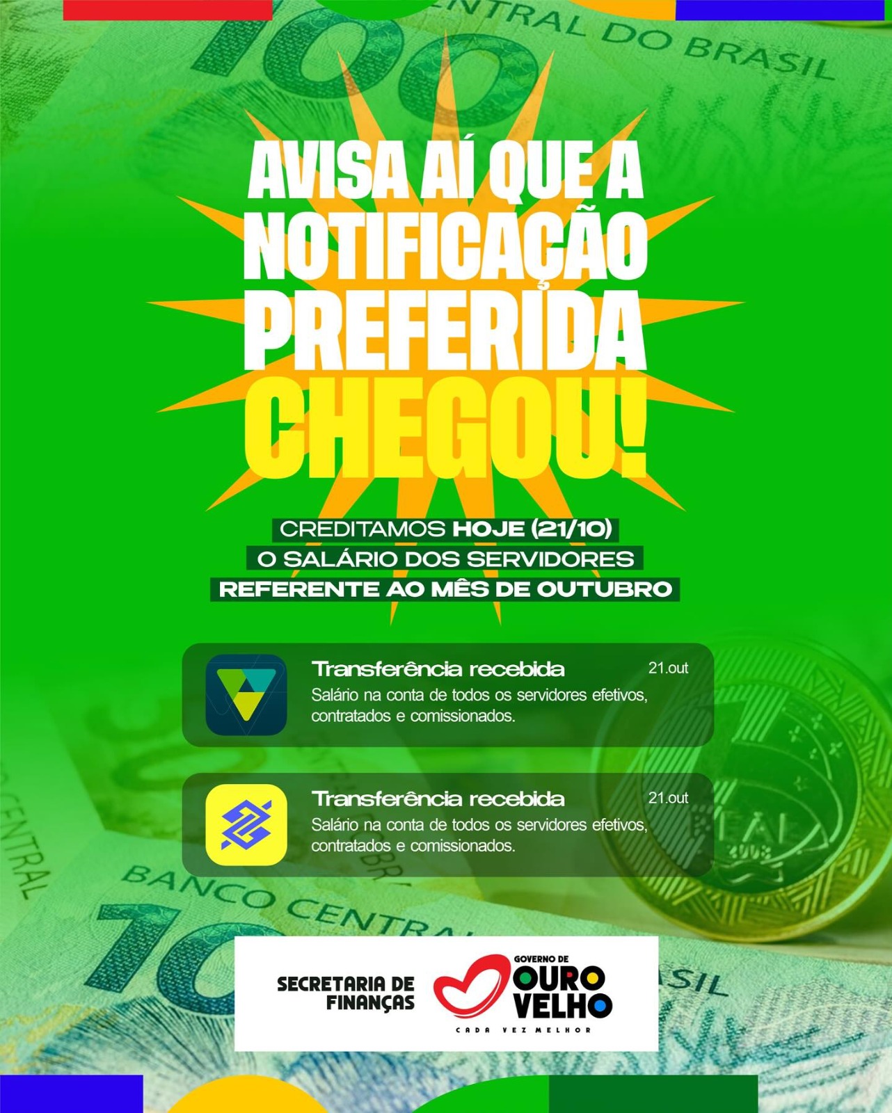 A terça-feira (21) começou com uma excelente notícia para os servidores municipais de Ouro Velho. A Prefeitura creditou, de forma antecipada, o salário de todos os funcionários — efetivos, contratados e comissionados — reforçando o compromisso da gestão com o respeito e a valorização de quem faz o serviço público acontecer.
