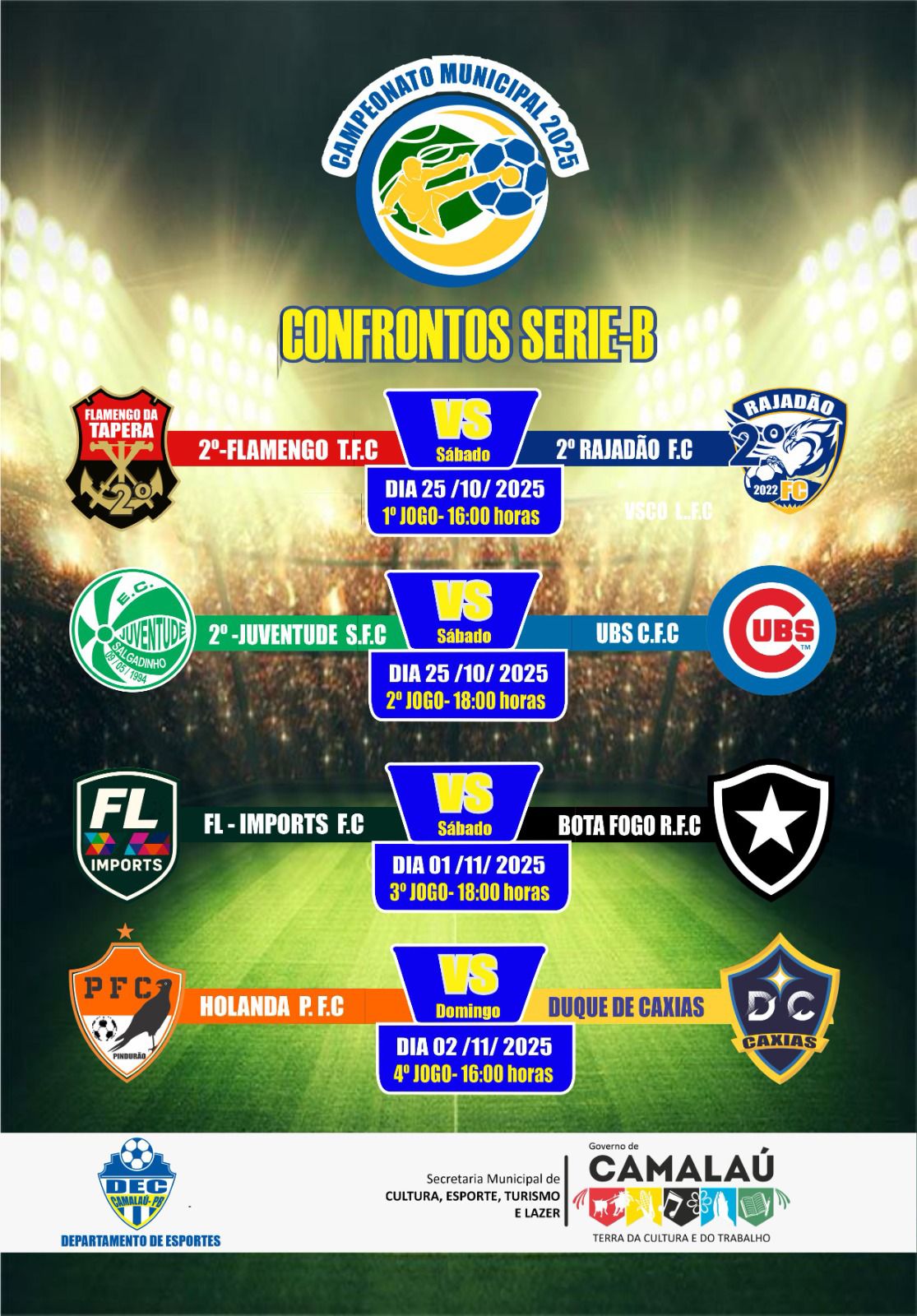 Série B abre a sequência de confrontos com partidas marcadas para os dias 25 de outubro, 1º e 2 de novembro de 2025, no Estádio Municipal de Camalaú. As equipes buscam destaque e sonham com o acesso à elite do futebol camalauense.