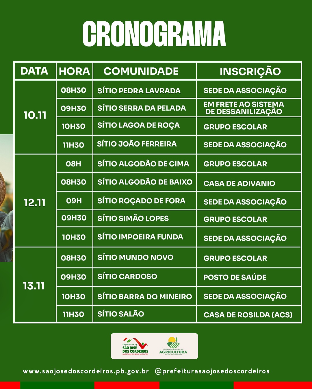 A Secretaria de Agricultura estará com equipes itinerantes percorrendo as comunidades rurais do município, seguindo um cronograma previamente definido. Os agricultores devem ficar atentos ao dia e horário de atendimento em cada localidade, para garantir sua inscrição dentro do prazo estabelecido.