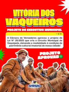 “Hoje celebramos não apenas a aprovação de um projeto, mas o reconhecimento de uma tradição que atravessa gerações. A vaquejada faz parte da alma do nosso povo, representa coragem, identidade, história e união. Com o Circuito Municipal de Vaquejada, reafirmamos nosso compromisso com a valorização cultural, o incentivo ao esporte tradicional e o fortalecimento de tudo aquilo que mantém vivas as nossas raízes. Amparo cresce quando respeita sua história, apoia seus vaqueiros e enaltece o que há de mais genuíno em nossa terra”, afirmou o prefeito Tarcio Gabriel.