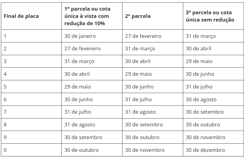 Os proprietários de veículos seguirão novamente o cronograma de pagamento, que se estende por dez meses. O vencimento varia de acordo com o final da placa: veículos com final 1 pagam em março; final 2, em abril; e assim sucessivamente, até dezembro, quando vencem os veículos com placa final 0, caso o contribuinte escolha a cota única sem desconto.