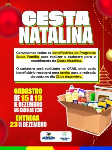 A entrega das cestas está programada para o dia 23 de dezembro, permitindo que as famílias tenham acesso aos alimentos antes das comemorações de Natal.