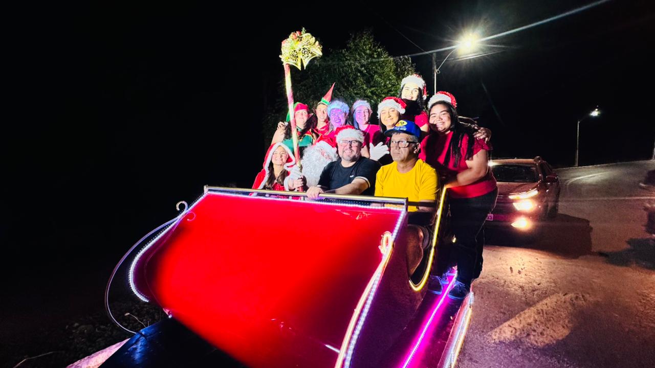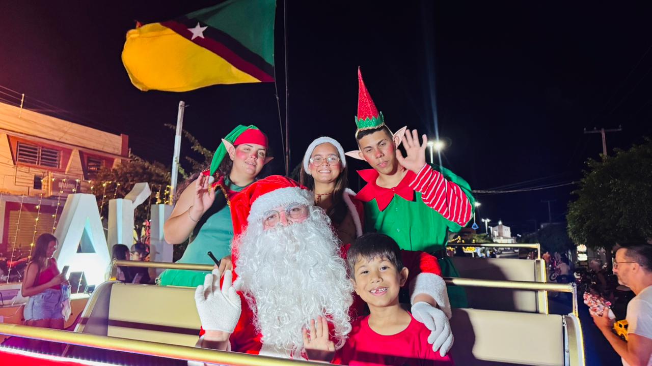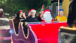 Papai Noel, ao lado do prefeito Bira Mariano e do vice-prefeito Gilberto, percorreu as principais ruas da cidade em seu tradicional trenó, levando o espírito natalino até a praça de eventos.