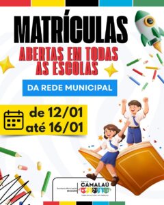 O período de matrícula acontece de 12 a 16 de janeiro, contemplando alunos da educação infantil, ensino fundamental e demais modalidades ofertadas pelo município.