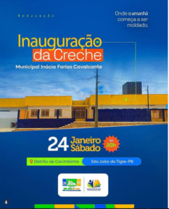 No próximo sábado, dia 24 de janeiro, às 20h, o Distrito de Cacimbinha, em São João do Tigre, viverá um momento histórico com a inauguração da Creche Municipal Inácia Farias Cavalcante. A entrega do novo equipamento educacional representa um importante avanço para a educação infantil do município e reforça o compromisso da gestão do prefeito Márcio Leite com o cuidado e o desenvolvimento das crianças.