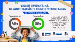 A educação de Sumé segue apresentando avanços significativos. Dados do Sistema de Avaliação da Educação Básica do Estado da Paraíba (SIAVE/CAEd) mostram que, em 2025, a rede municipal alcançou 85% de fluência em leitura entre os alunos do 2º ano do Ensino Fundamental. O resultado representa um crescimento considerável em relação à avaliação inicial, que apontava 40%, evidenciando a evolução do processo de ensino e aprendizagem no município.