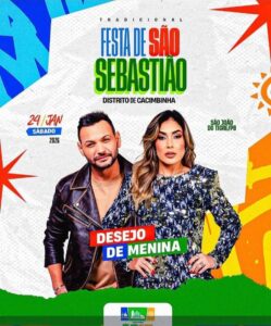 Logo após a solenidade de inauguração, a programação festiva continua com a segunda noite de shows da Festa de São Sebastião, levando muita música e animação ao público presente. Sobem ao palco as bandas Desejo de Menina e Leandro Pinga Fogo, prometendo uma noite de grande participação popular e celebração.