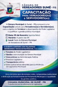 A Câmara Municipal de Sumé – PB promoverá, no próximo dia 05 de fevereiro (quinta-feira), uma capacitação voltada para vereadores(as) e servidores(as), com o objetivo de fortalecer o desempenho do Poder Legislativo e aprimorar a qualidade da gestão pública municipal.