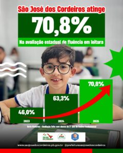 O município de São José dos Cordeiros registrou um importante avanço nos índices de alfabetização em 2025. De acordo com dados educacionais, 70,8% dos alunos do 2º ano do Ensino Fundamental já são considerados leitores, número que representa um crescimento expressivo em comparação com a avaliação de entrada, que apontava 26,9%.