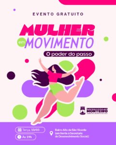 A Prefeitura de Monteiro, por meio da Secretaria de Desenvolvimento Social, promoverá um evento especial em alusão ao Dia Internacional da Mulher. A ação terá como tema “Mulher em Movimento: O Poder do Passo”, destacando a importância da valorização, do cuidado e do fortalecimento das mulheres no município e acontecerá nesta terça-feira dia 10 de março, em frente à Secretaria de Desenvolvimento Social, no Bairro Alto de São Vicente às 19h.