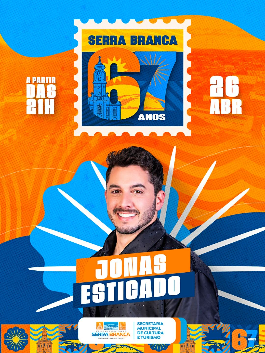 A Prefeitura de Serra Branca anunciou oficialmente a segunda atração da programação cultural em comemoração aos 67 anos de emancipação política do município. O cantor Jonas Esticado, um dos grandes nomes do forró contemporâneo no Brasil, está confirmado e será responsável por abrir a série de shows que irão marcar a tradicional festa da cidade.