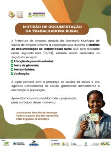 A Prefeitura de Amparo, por meio da Secretaria Municipal de Saúde, participará do Mutirão de Documentação da Trabalhadora Rural com a oferta de diversos serviços gratuitos voltados ao cuidado com a saúde da população. A ação acontece nesta segunda-feira, 16 de março, a partir das 8h, na Escola Tertulina M. Nóbrega.