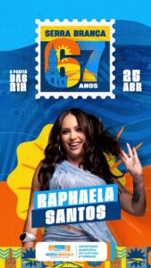 A cidade de Serra Branca já está em clima de festa! Em comemoração aos seus 67 anos de emancipação política, mais uma grande atração foi confirmada na programação: a cantora Raphaela Santos promete agitar o público com um show cheio de energia e sucessos.