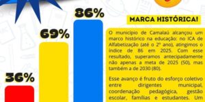 O município de Camalaú vem se destacando no cenário educacional ao alcançar um resultado expressivo no Indicador Criança Alfabetizada (ICA). Em 2025, a cidade atingiu a marca de 86% de crianças alfabetizadas, superando não apenas a meta estabelecida para o ano, mas também antecipando a meta que estava prevista apenas para 2030.