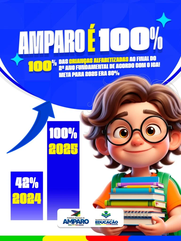 A Prefeitura de Amparo comemorou um marco histórico na educação do município: 100% das crianças foram alfabetizadas ao final do 2º ano do Ensino Fundamental. O resultado representa um avanço significativo em relação a 2024, quando o índice era de 42%.