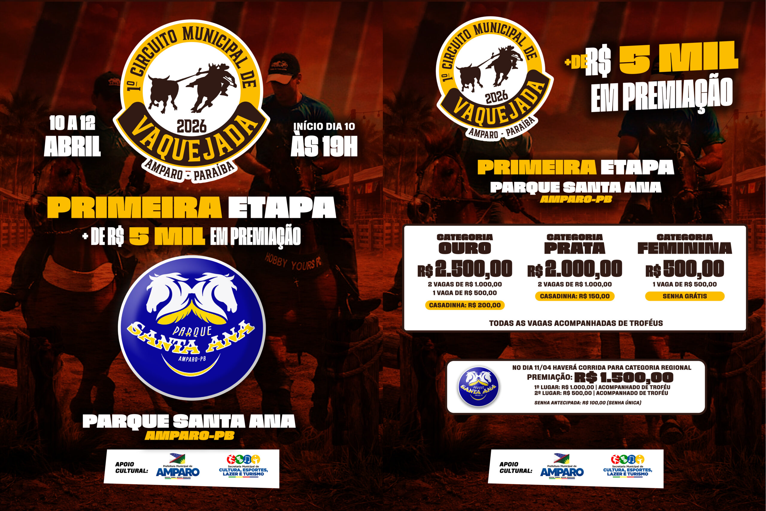 A cidade de Amparo dá início nesta sexta-feira (10/04) à 1ª etapa do Circuito Municipal de Vaquejada 2026. O evento acontece no Parque Santa Ana e segue até o domingo (12/04), reunindo vaqueiros de toda a região em uma grande celebração da cultura nordestina.