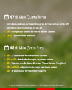 Durante os três dias, produtores, criadores e visitantes poderão acompanhar uma programação diversificada, com exposições de animais, demonstrações e atividades voltadas à valorização da qualidade do rebanho local. A iniciativa tem como foco principal fortalecer os caprinocultores e ovinocultores, promovendo conhecimento técnico, troca de experiências e incentivo à produção rural.