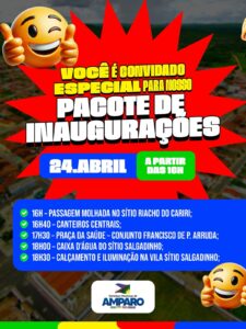 A agenda tem início às 16h, no Sítio Riacho do Cariri, com a entrega de uma passagem molhada. Em seguida, às 16h40, serão inaugurados os canteiros centrais. Já às 17h30, a comitiva segue para a Praça da Saúde, localizada no Conjunto Francisco de P. Arruda. Às 18h, acontece a entrega da caixa d’água no Sítio Salgadinho e, finalizando a programação, às 18h30, será inaugurado o calçamento com iluminação na Vila Sítio Salgadinho.