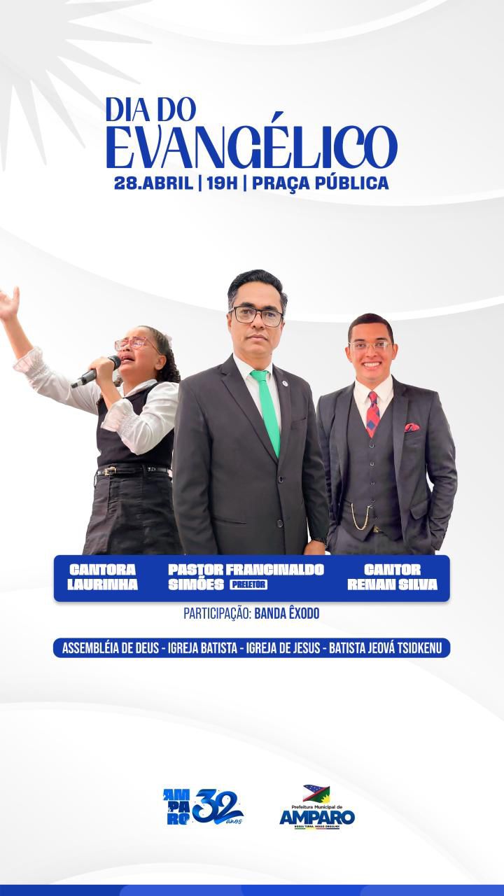 A Prefeitura de Amparo promove nesta terça-feira, 28 de abril, o Dia do Evangélico, dentro da programação pelos 32 anos de Emancipação Política do município. O evento será realizado a partir das 19h, em praça pública, reunindo fiéis e a população em geral.